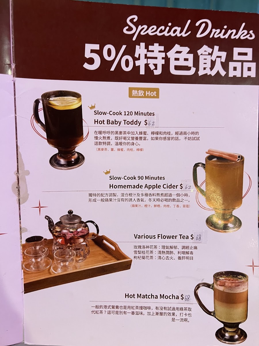 For something comforting yet tantalizing, try the Homemade Apple Cider (HK$52), crafted with a secret blend of spices and fresh ingredients. The aroma alone will wrap you in a warm embrace, making it the ideal choice for a chilly day. If you’re feeling under the weather, the Hot BabyToddy serves not only to soothe but also nourish, combining warm barley tea, honey, lemon, and a hint of cinnamon to lift your spirits.